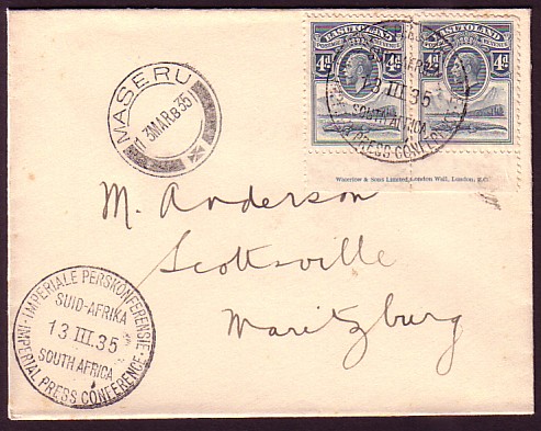 Basutoland: 1935 cover franked KG V 4d grey Waterlow imprint pair cancelled Imperial
